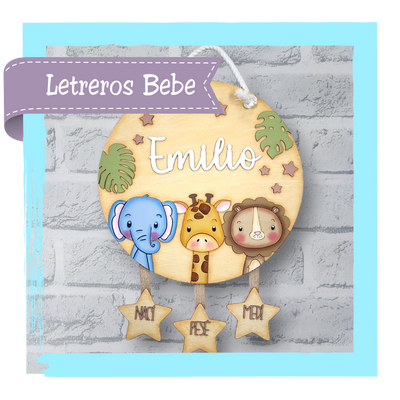 Letrero en madera MDF para Recién Nacido con jirafa, cebra, leon, elefante y chango, sin...